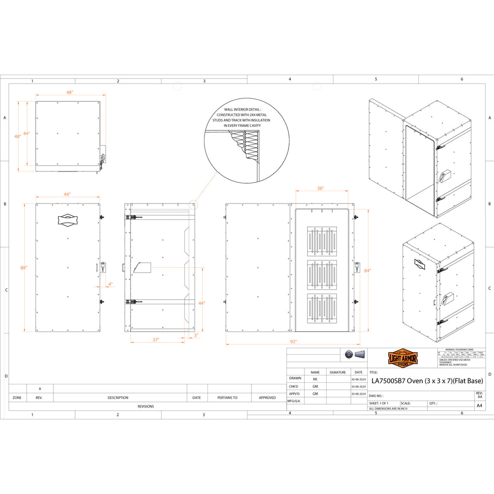 The LA7500SB7 Curing Oven is an industrial-grade oven that increases efficiency in the curing process of composite and other materials. This product offers accurate temperature control and even heat distribution. It is also able to effectively maintain temperature throughout the curing process to ensure consistent and even results for all finished products. This model of curing oven available from Light Armor can produce a maximum temperature of 500 degrees F, making it capable of handling the curing process for any kind of material.The galvanized metal used for this curing oven gives it rust-resistance and longevity, while also making the oven withstand the tough conditions of an industrial setting. It can cure epoxy resin, powder coating, carbon fiber, polymers, plastic composites, rubber, adhesives, thermoplastics, and more. You can expect the optimal cure with the temperature uniformity and fast cooling rate of this curing oven.