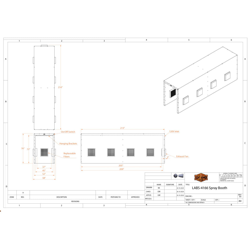 The LABS-4166 Spray Booth from Light Armor is a specialized paint booth and finishing system. It is manufactured in the USA to maintain the safe and hygienic conditions required for workers who will perform the spray painting job. You may customize the booth design to be open or enclosed, depending on your painting needs. The inside working space has a dimension of 45" W x 205" D x 72" T; paint booth designs and dimensions can be adjusted to fit the parts or equipment to be painted.
