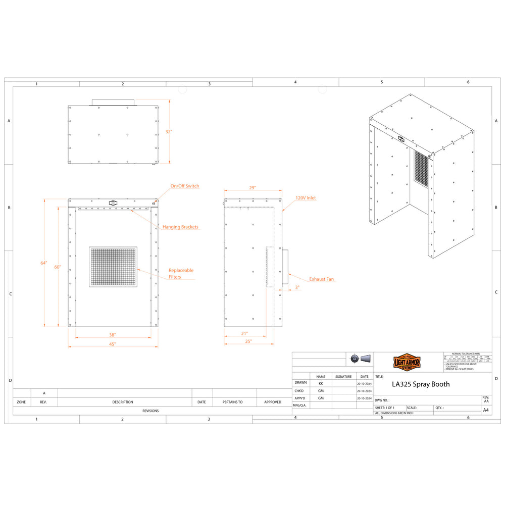 The LA325 has an inside nominal dimensions of 38" W x 23" D x 60" T and features reinforced hanging racks for hanging hooks and objects off of, powerful LED lighting, and a 3,000 CFM air circulator for capturing stray powder. The included filter is washable and can be reused over and over without the maintenance costs of replacing filters. Not stocked and has build time - please email us for up to date build times.